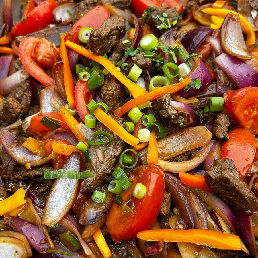 Lomo Saltado: Malse stukjes ossenhaas gebakken op hoog vuur met tomaat, ui en peper, vergezeld van friet en rijst. De perfecte fusie tussen Peru en het Oosten die al generaties lang smaakpapillen verovert.