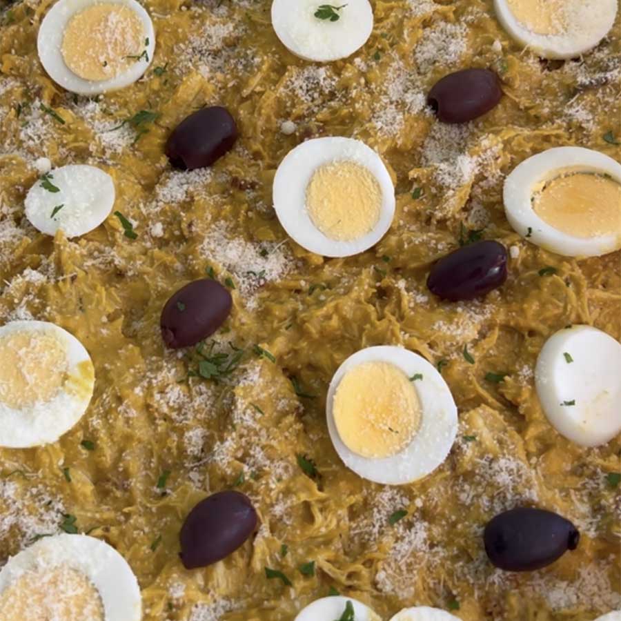 Ají de Gallina: Romige stoofschotel van geplukte kip in gele pepersaus met melk en noten, geserveerd met rijst, aardappel en olijven. De huiselijke omhelzing van de Peruaanse keuken, troostend en vol smaak.