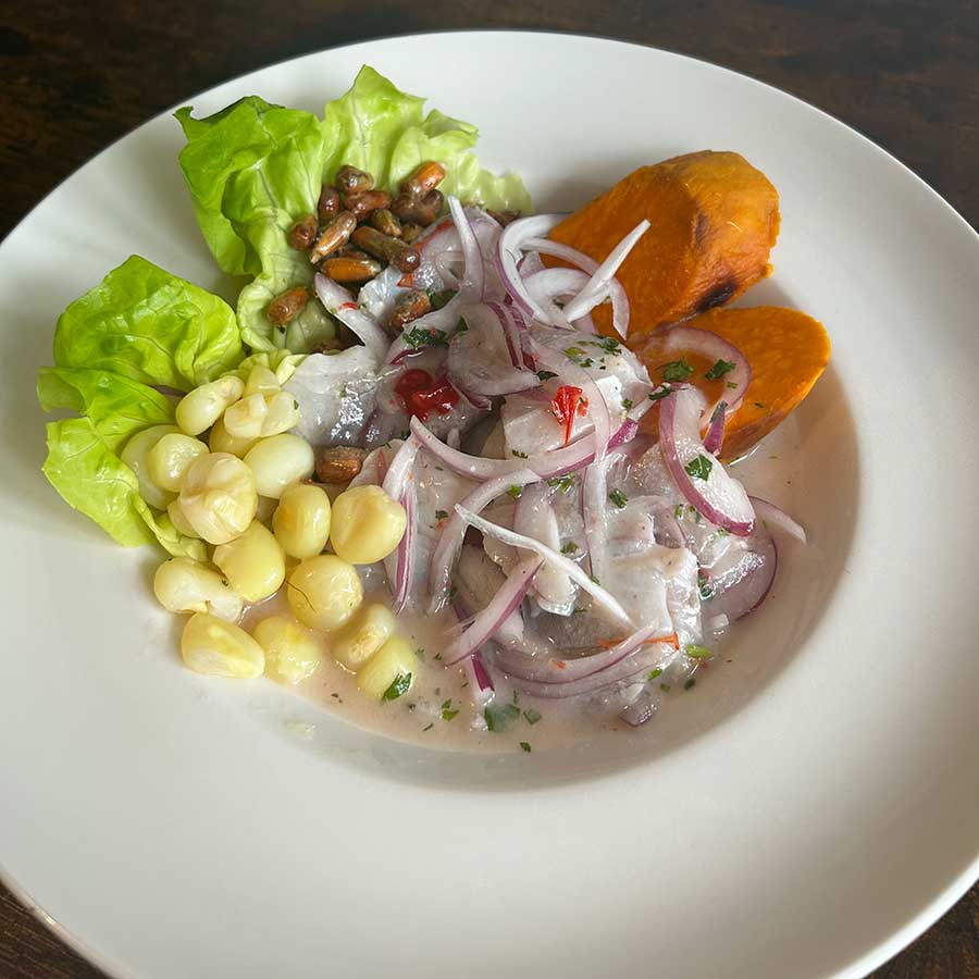 Klassieke Ceviche: Verse vis gemarineerd in limoensap met rode ui, limopeper en koriander, geserveerd met zoete aardappel, maïs en geroosterde maïskorrels. Het nationale gerecht van Peru, verfrissend, citrusachtig en vol zeeleven.